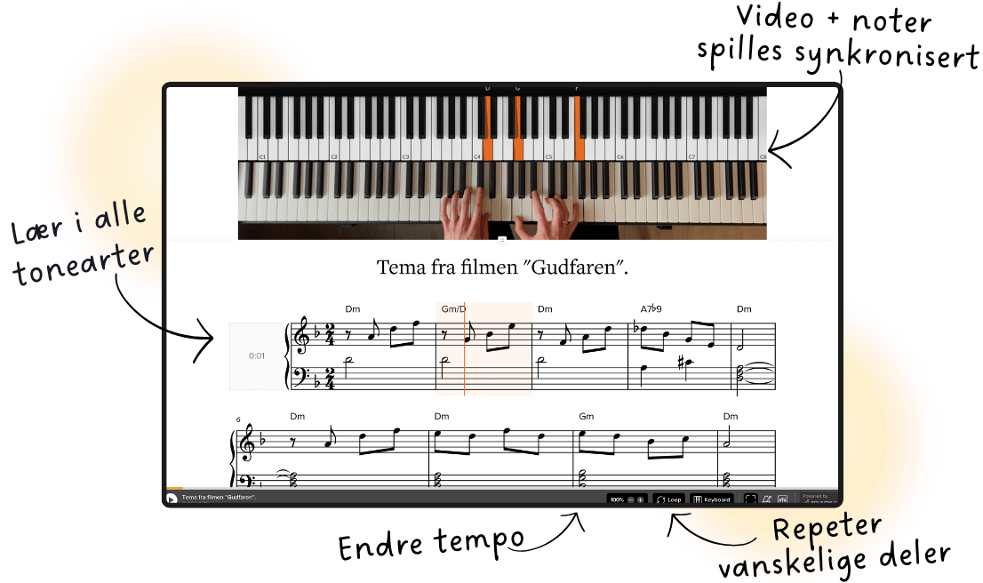 - Du får både nedlastbare noter og interaktive videonoter, så du kan følge med visuelt og se akkurat hva som skjer.