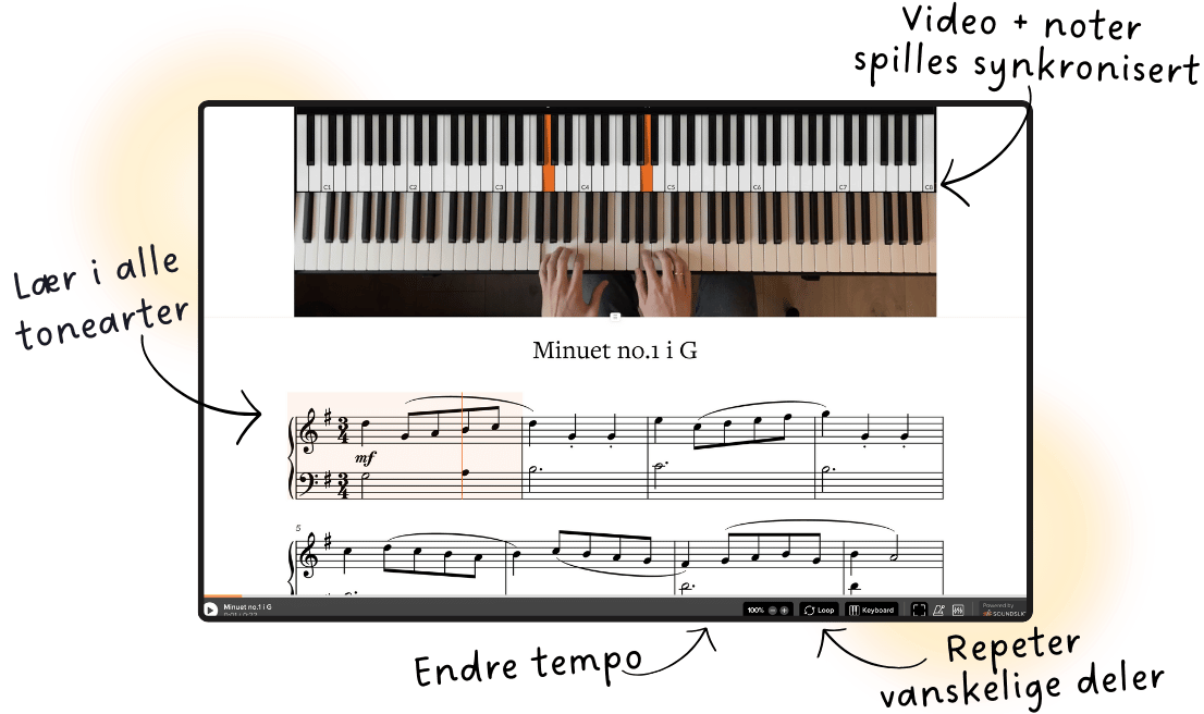- Du får både nedlastbare noter og interaktive videonoter, så du kan følge med visuelt og se akkurat hva som skjer.