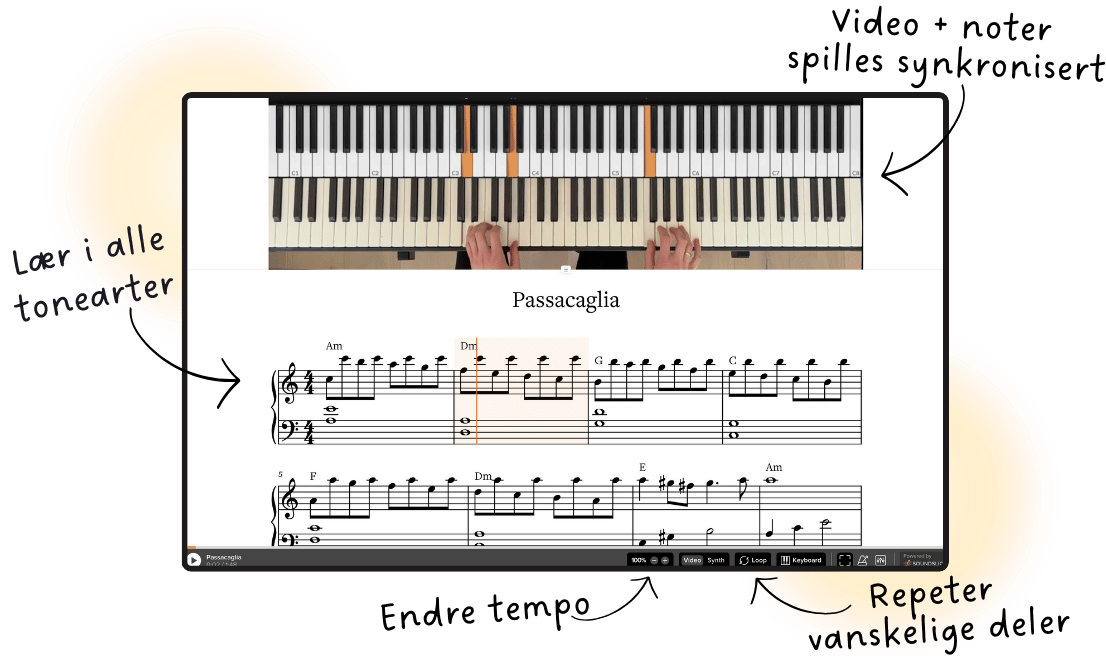 - Du får både nedlastbare noter og interaktive videonoter, så du kan følge med visuelt og se akkurat hva som skjer.