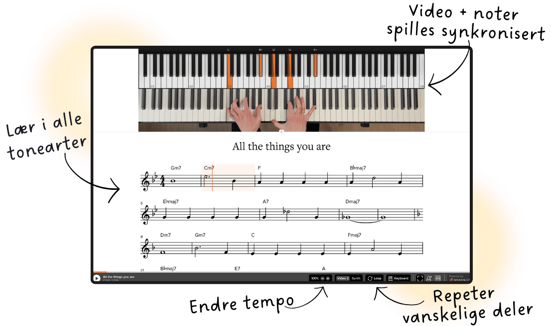 - Du får både nedlastbare noter og interaktive videonoter, så du kan følge med visuelt og se akkurat hva som skjer.