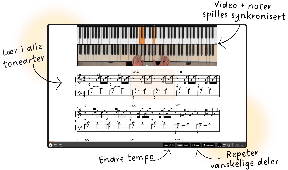 - Du får både nedlastbare noter og interaktive videonoter, så du kan følge med visuelt og se akkurat hva som skjer.