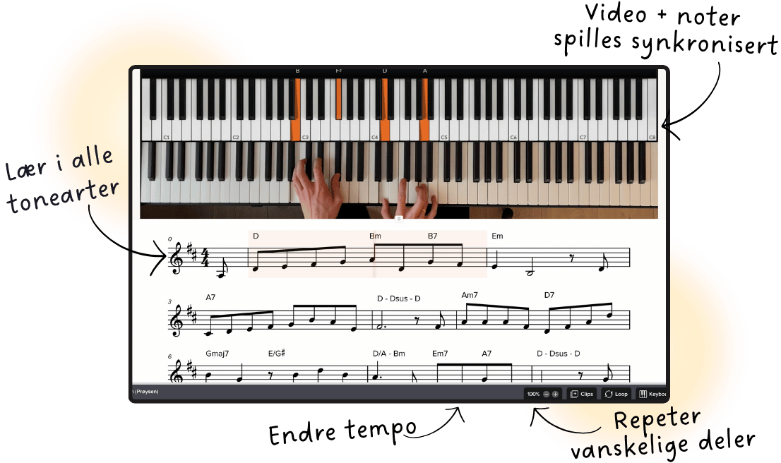- Du får både nedlastbare noter og interaktive videonoter, så du kan følge med visuelt og se akkurat hva som skjer.